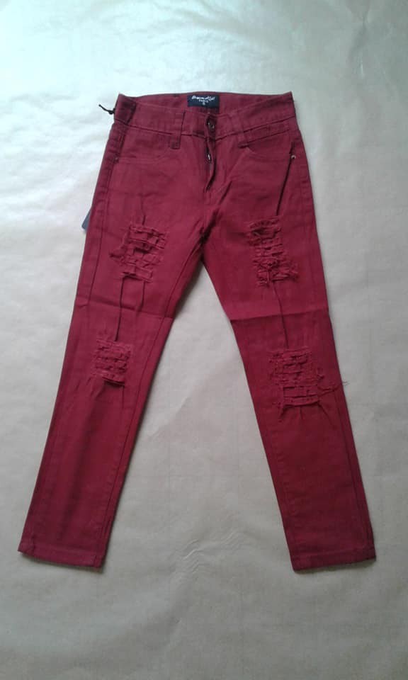 Jeans garçn taille réglable effet déchiré devant de couleur bordeau.