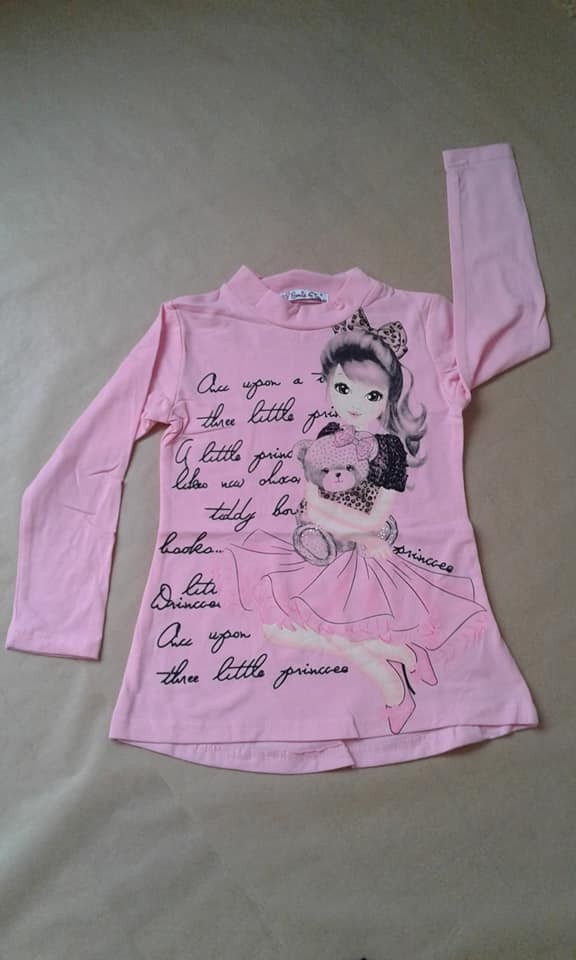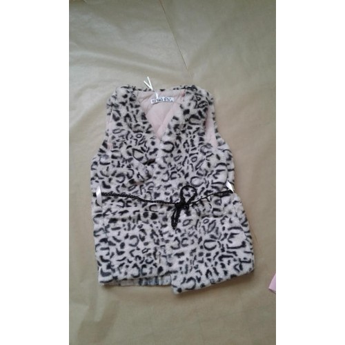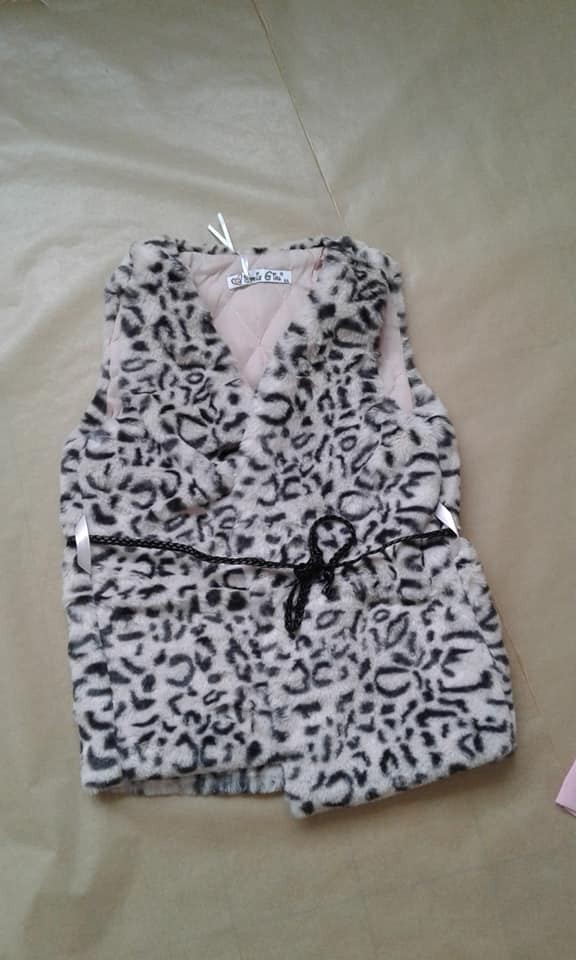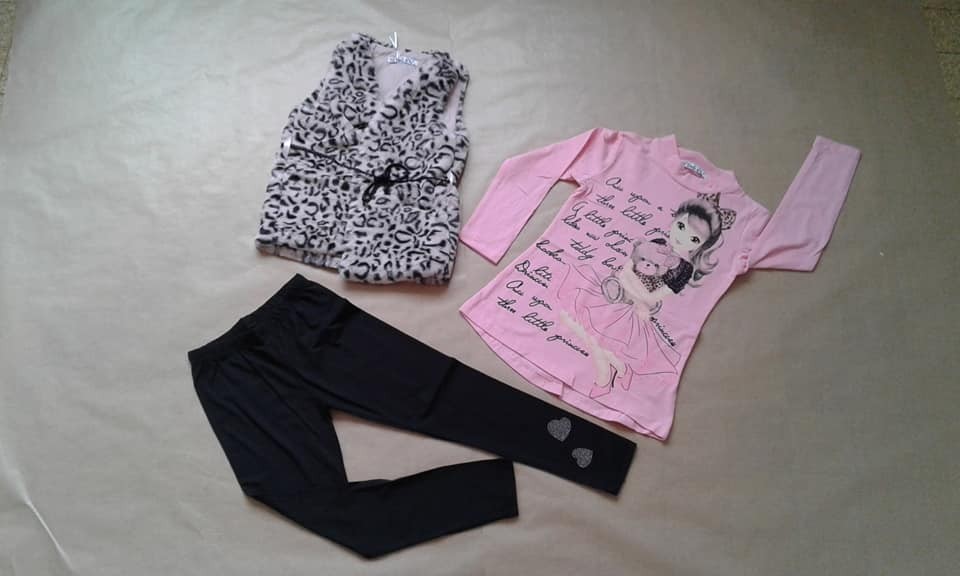 Ensemble en coton comprenant un leggings noir avec motif coeur, un t-shirt manche longue rose avec motif et un gilet fourré sans manche noir et rose avec ceinture cordelette noir.