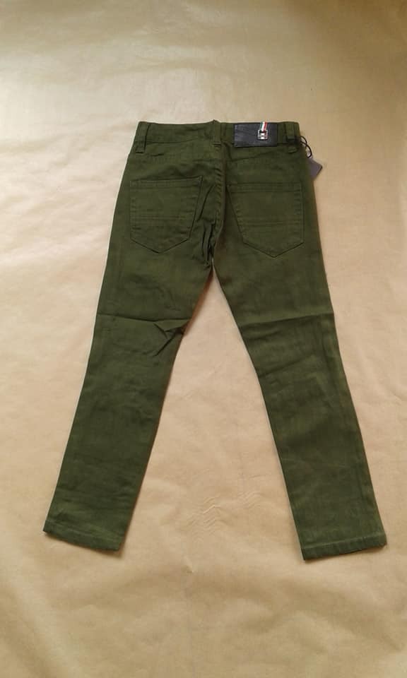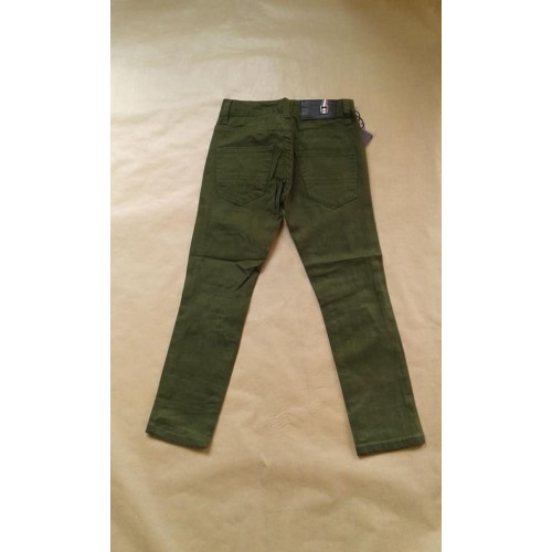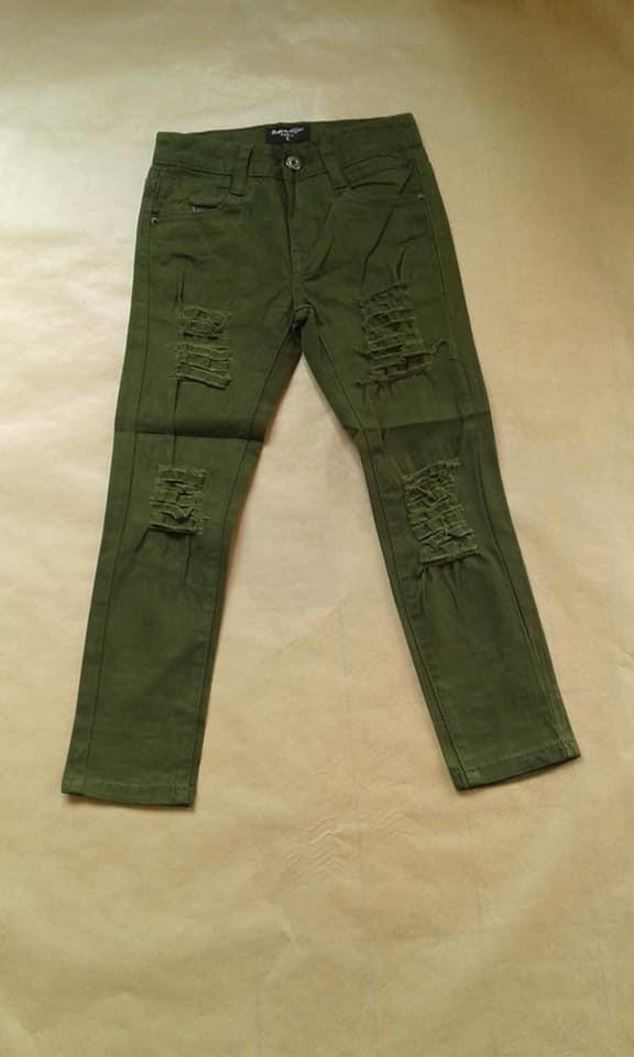 Jeans garçon taille réglable effet déchiré devant de couleur vert foncé.