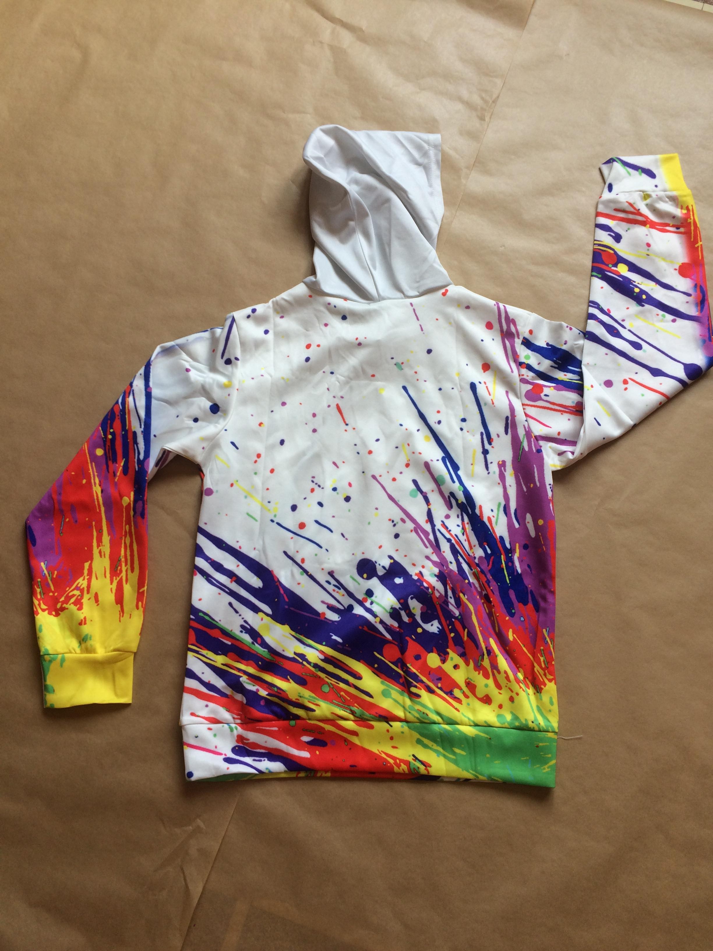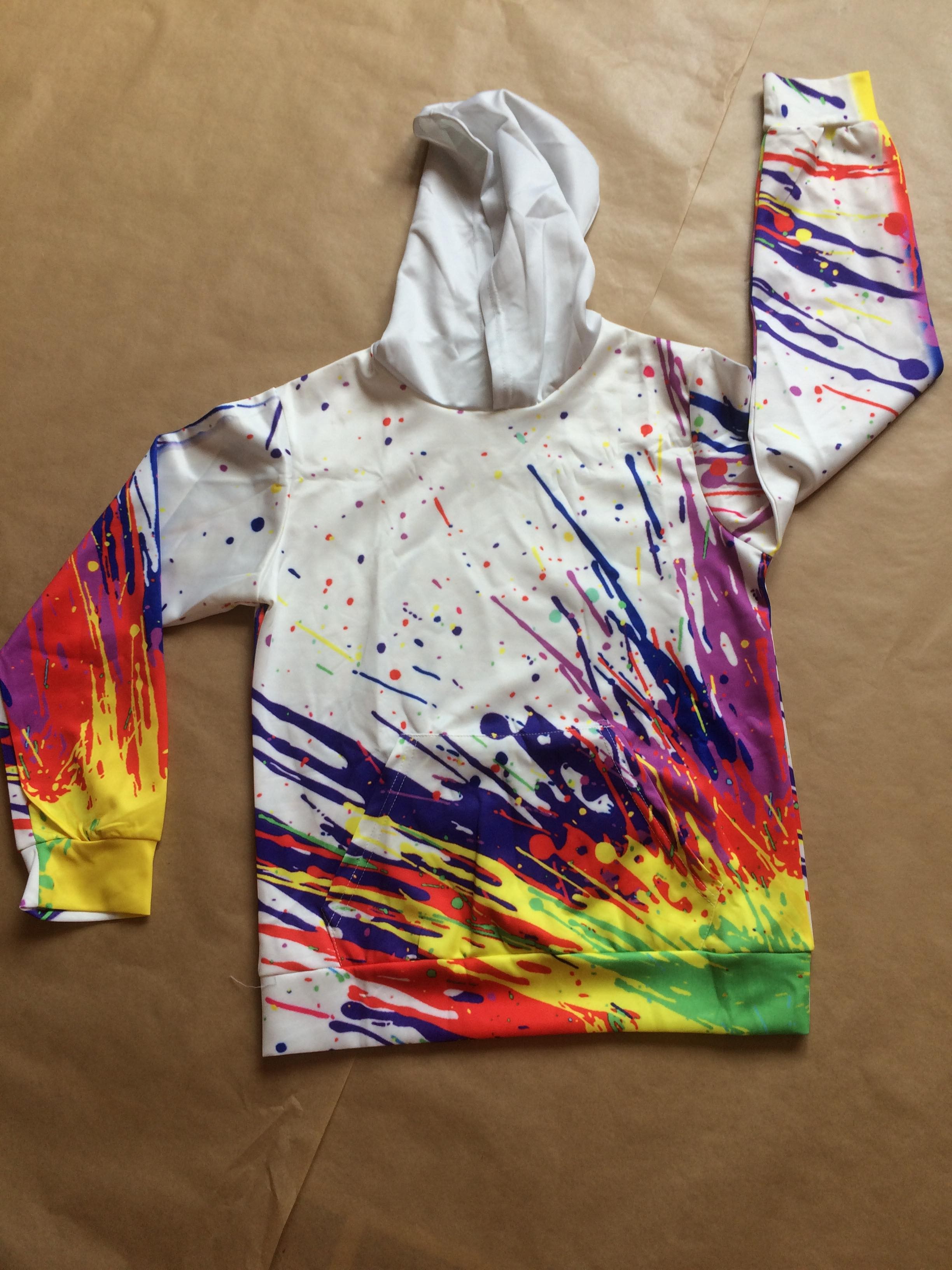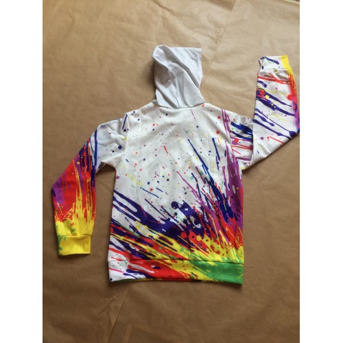 Sweet avec capuche de couleur blanc et effet explosion de peinture.